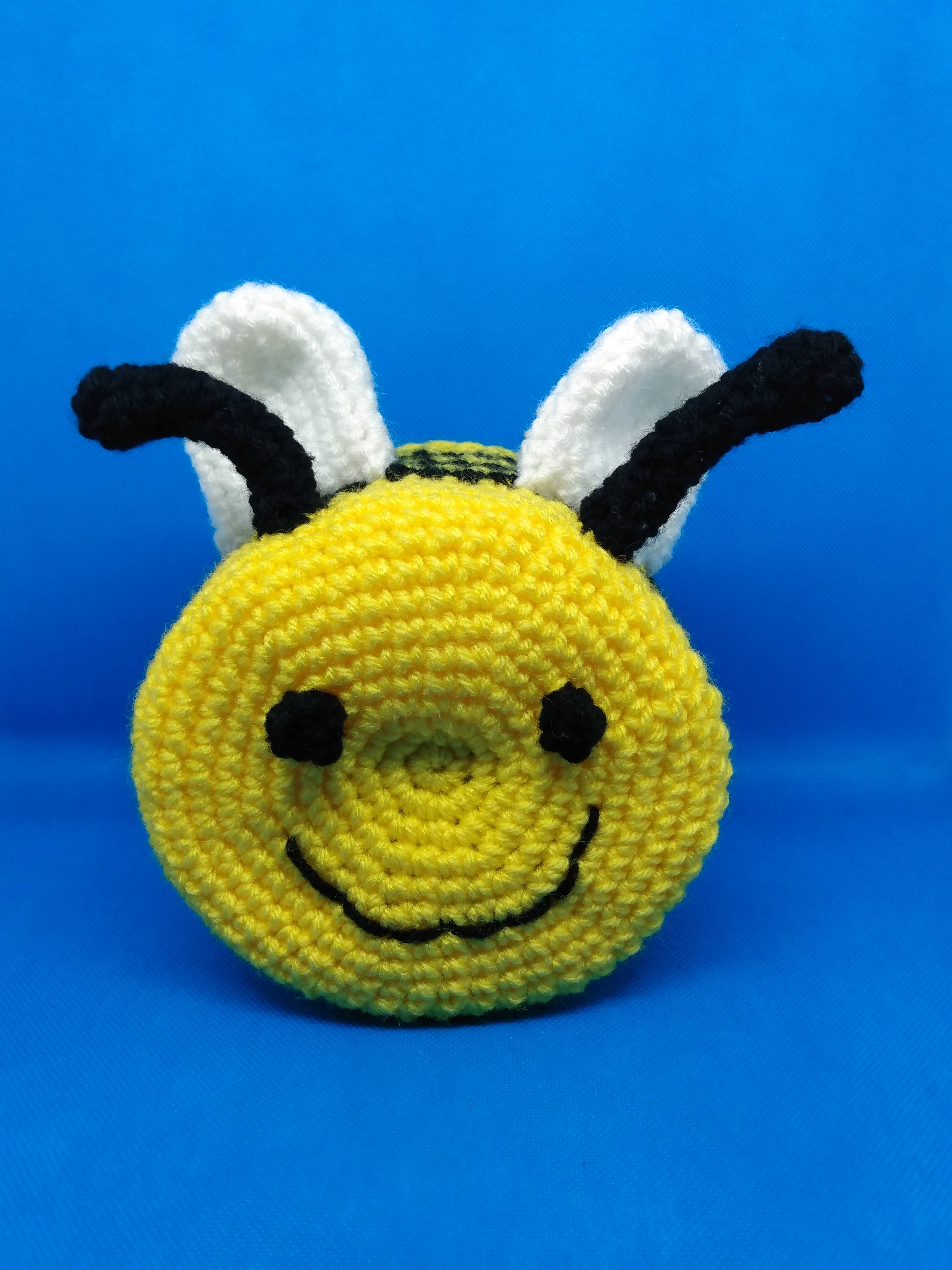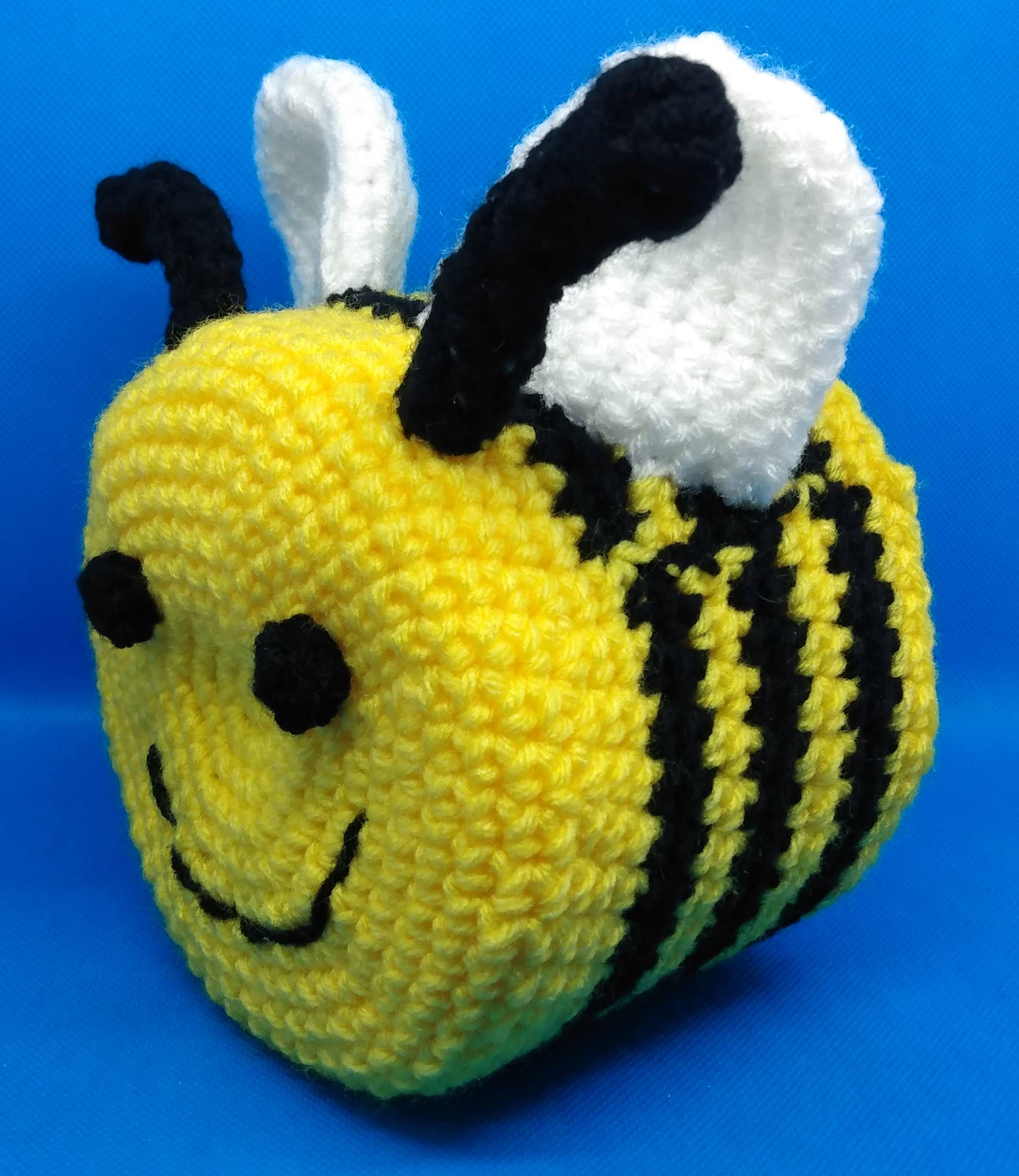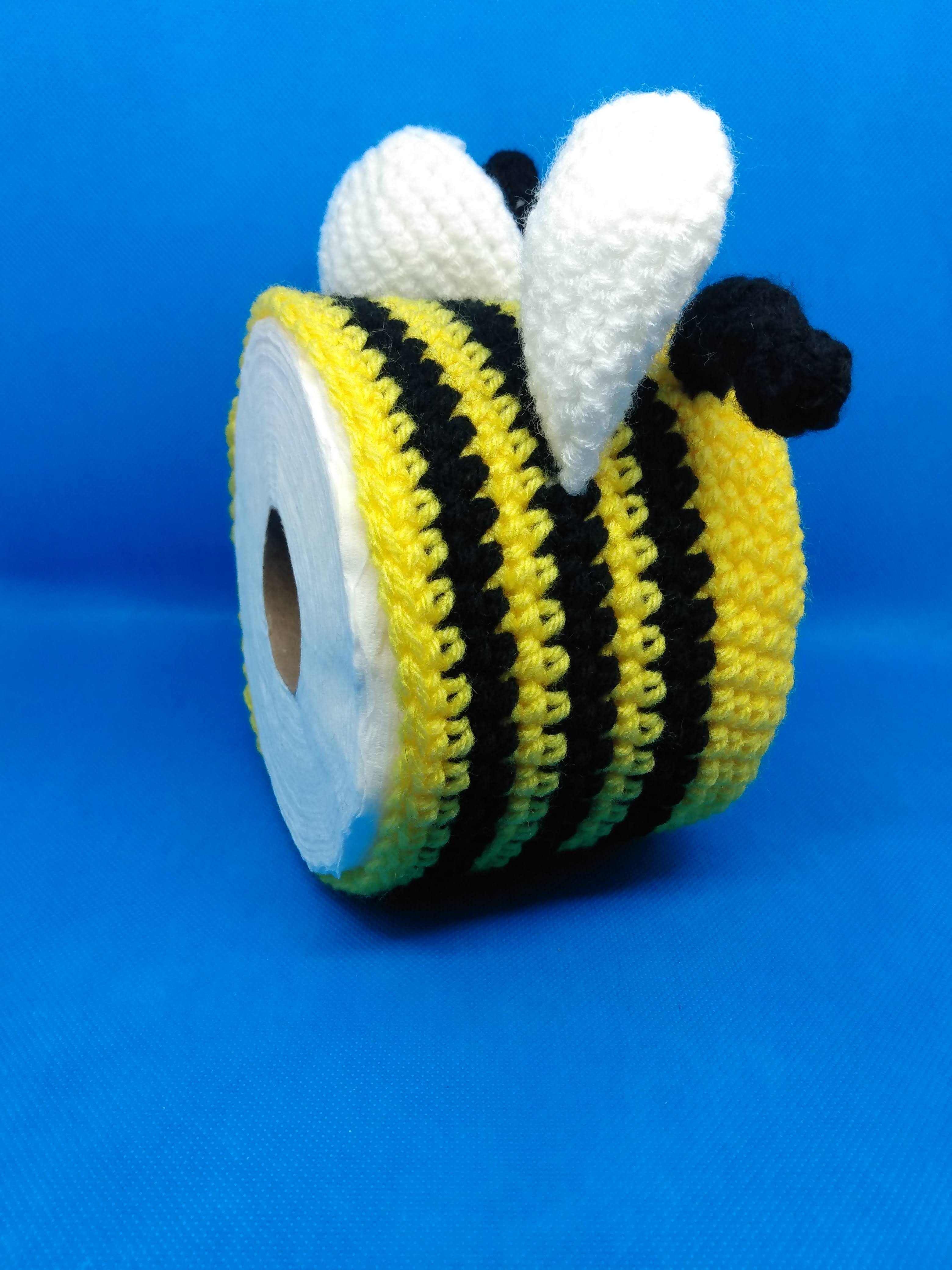 The bumblebee toilet roll cover is hand stitched using yellow, black and white worsted weight yarn. Details include two black antennae and two white wings. The bumblebee toilet paper holder is a honey of a bathroom accessory that works with any bathroom decor. This spare roll holder is modeled on a mega size roll of toilet paper which is not included.