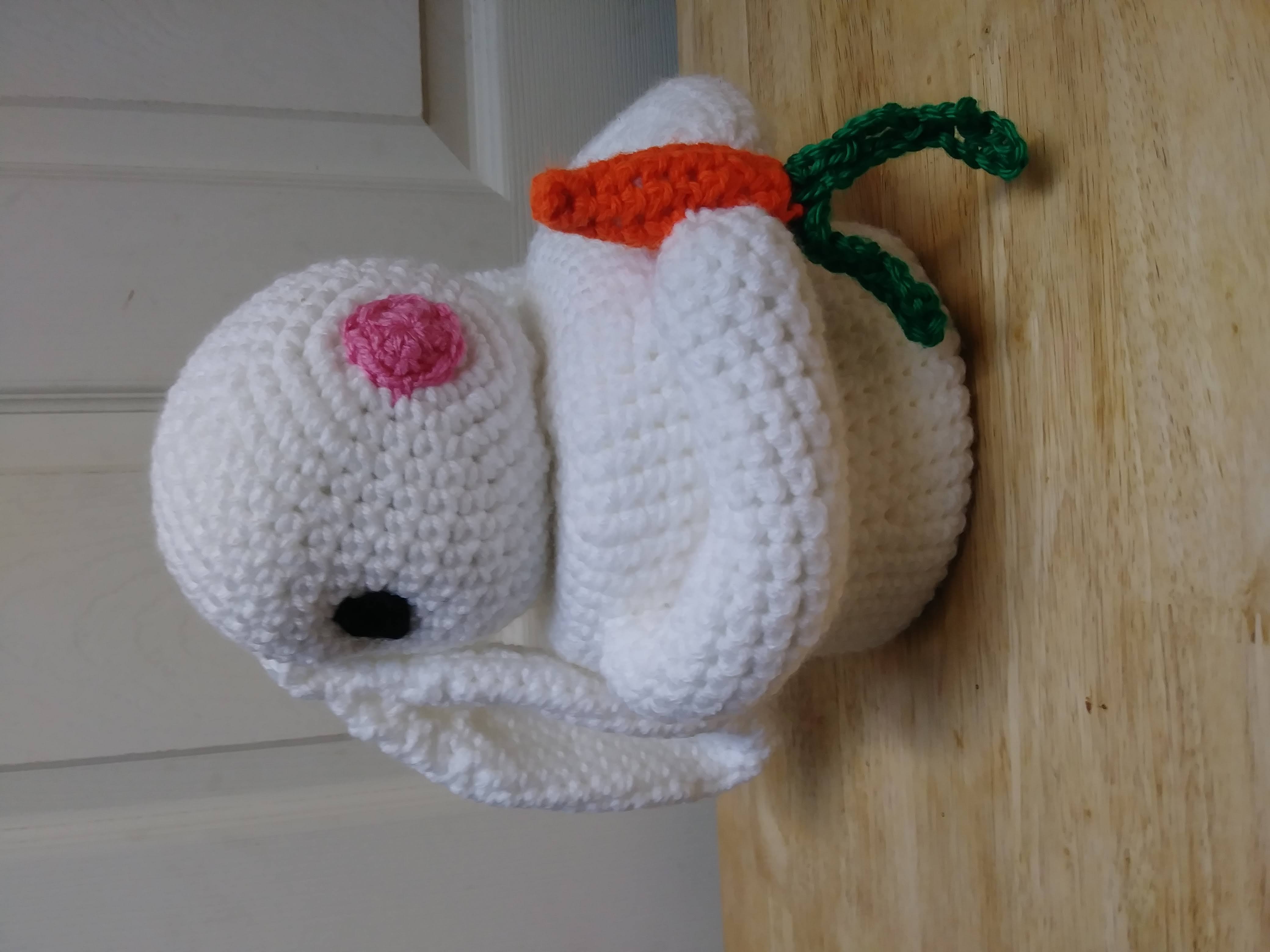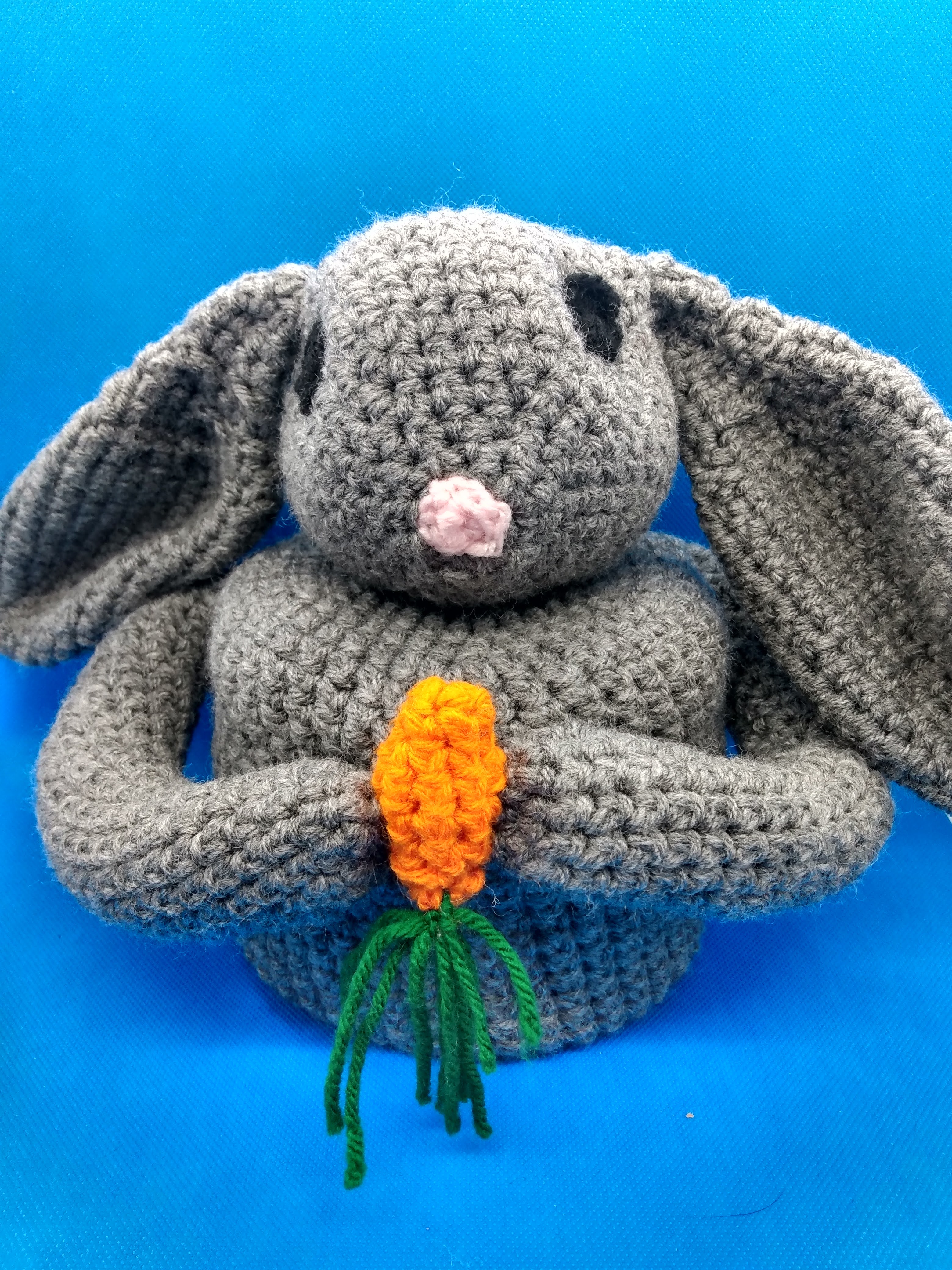 The bunny rabbit toilet roll cover is available in white or gray and hand stitched using worsted weight yarn. The bunny holds a carrot stitched with orange and green worsted weight yarn. This spare roll holder is modeled on a mega size roll of toilet paper which is not included.