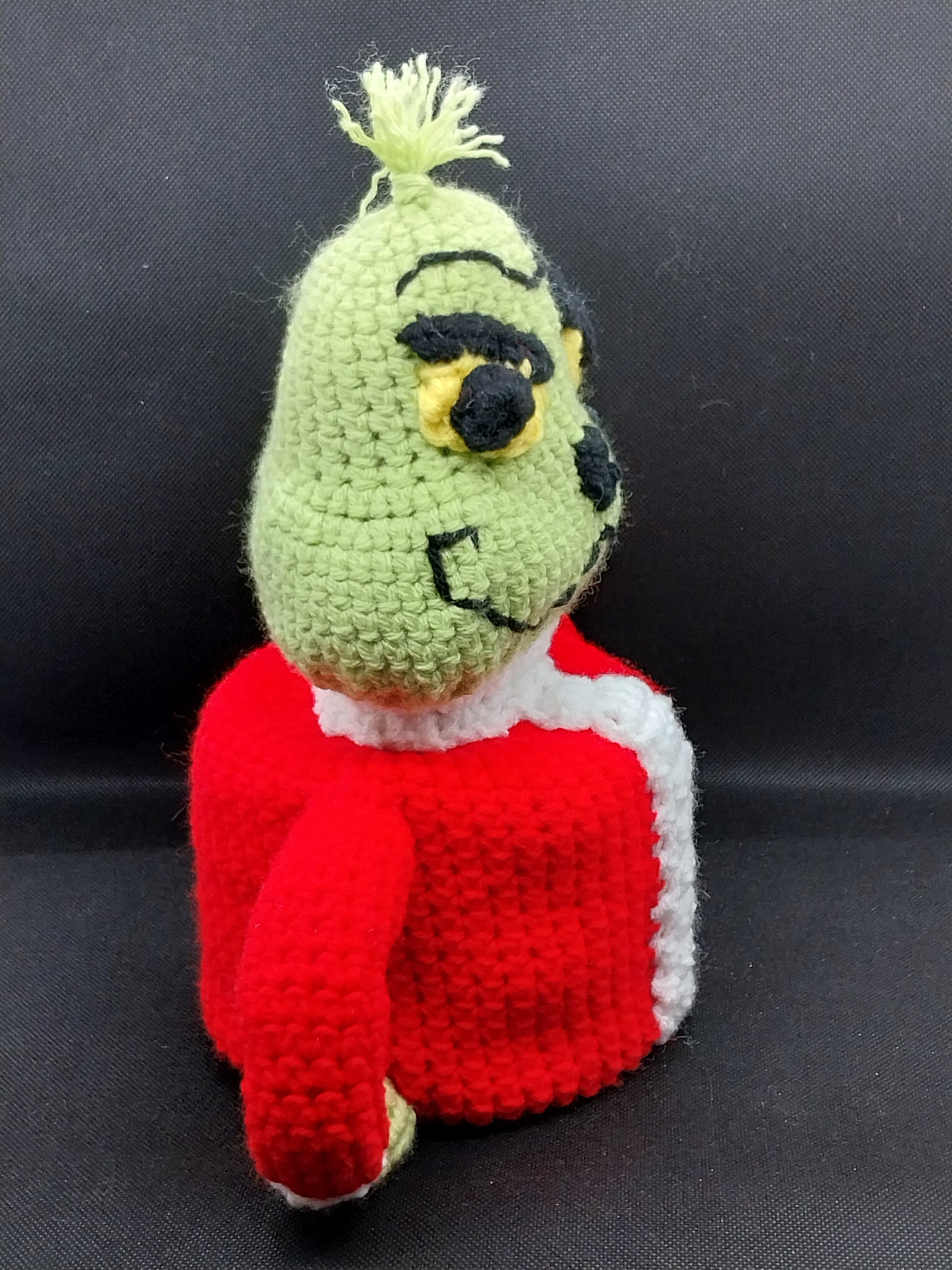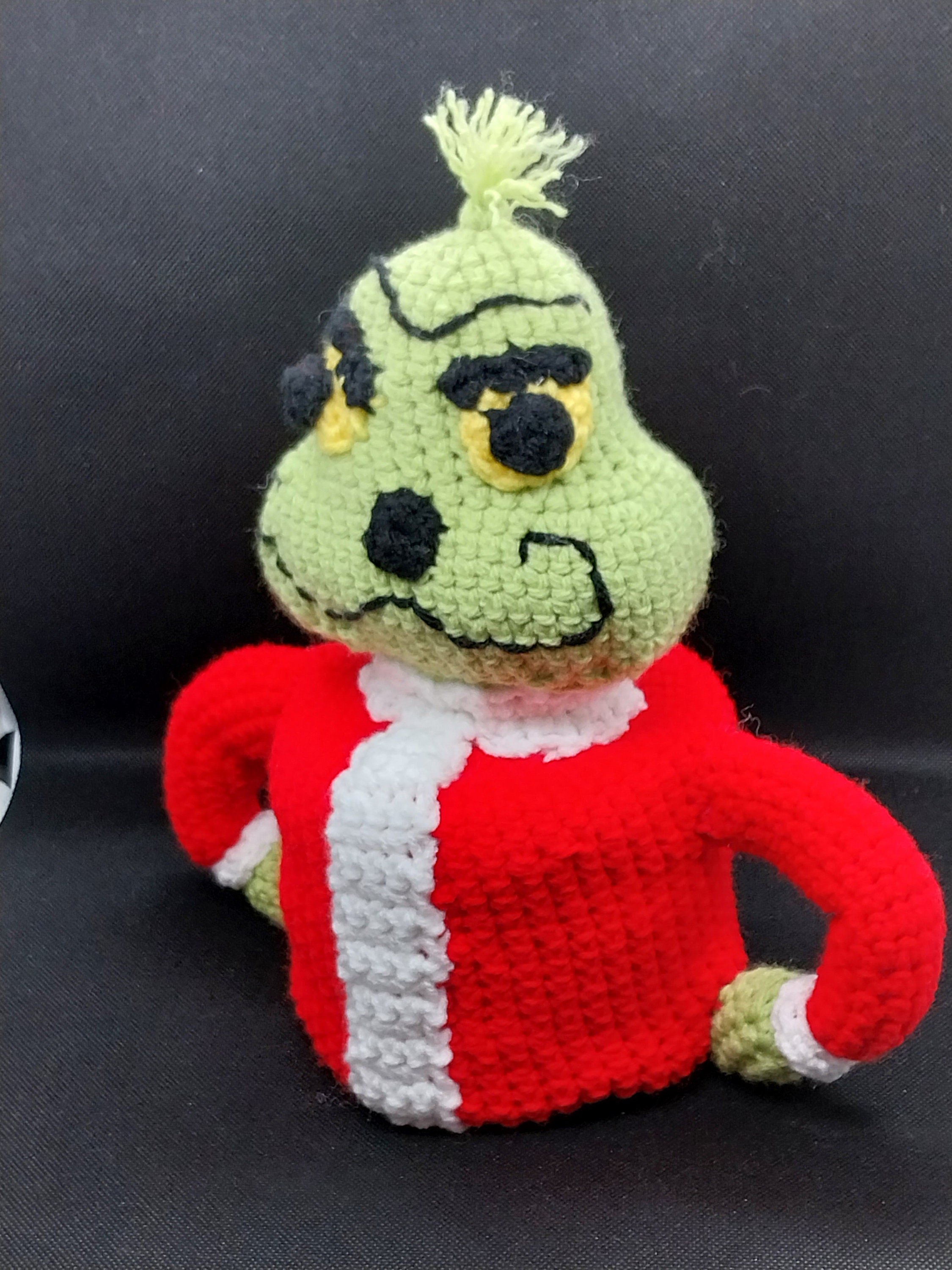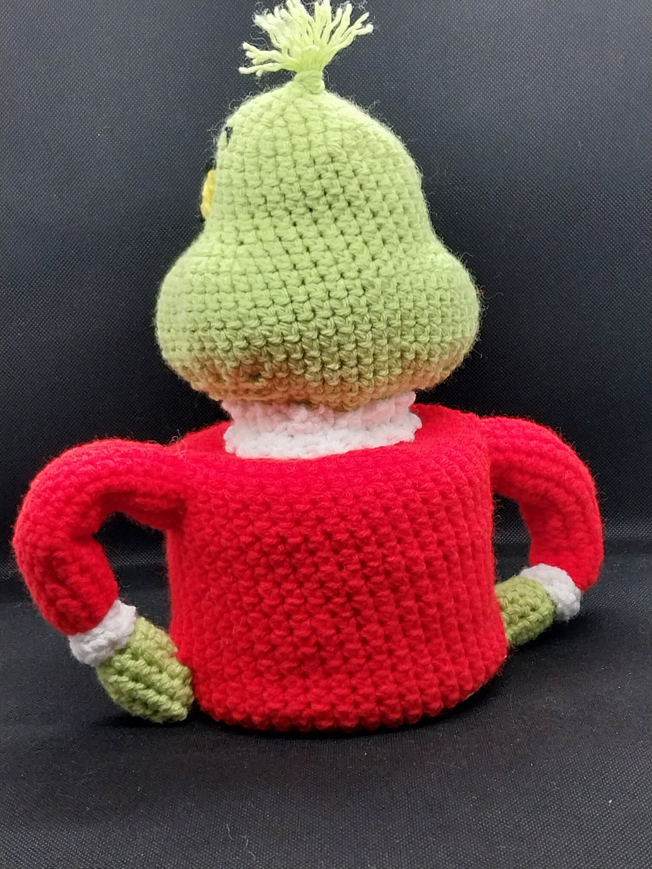 Hand crocheted Grinch Toilet Paper Cover makes a fun holiday decoration for the hardest ram to decorate. This bathroom storage keeps that precious extra roll handy yet hidden. This handmade gift is great for those on your lists that you may find hard to buy for. Modeled on a mega size roll.