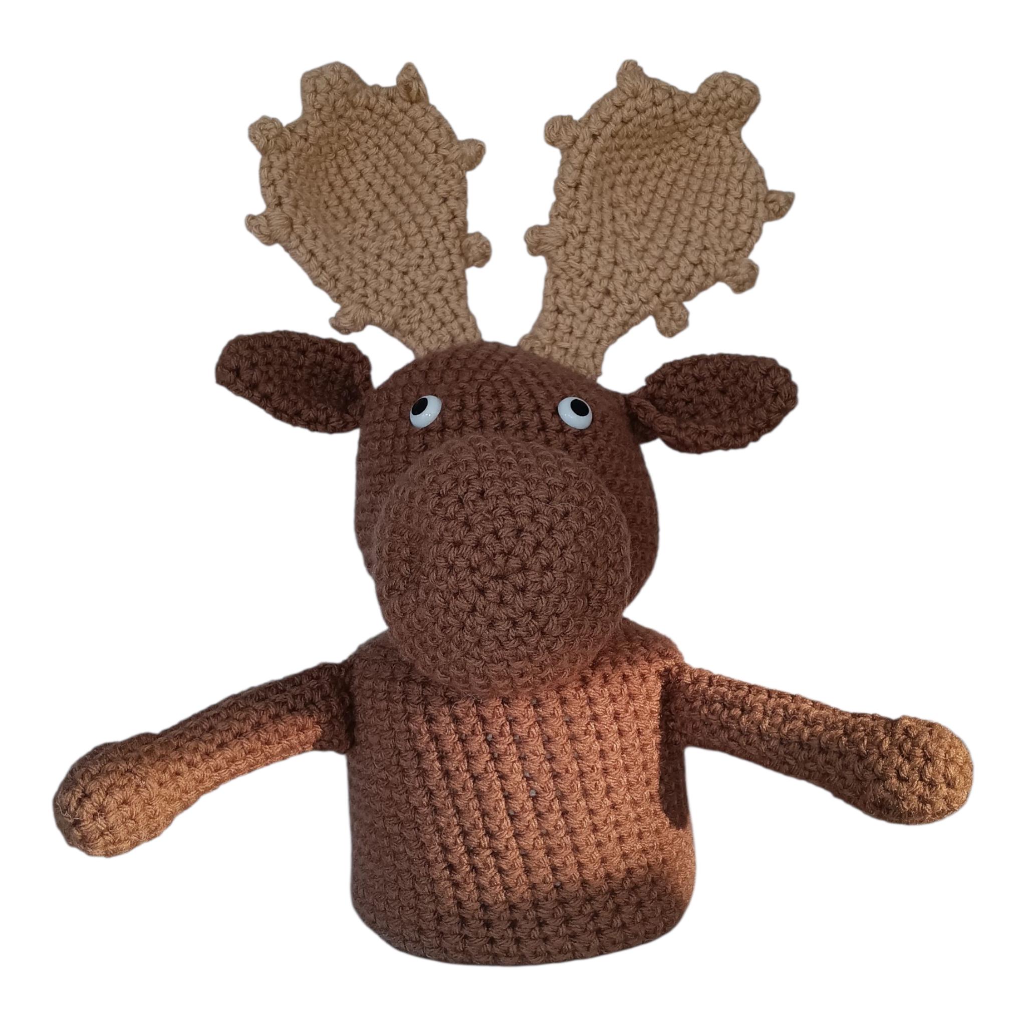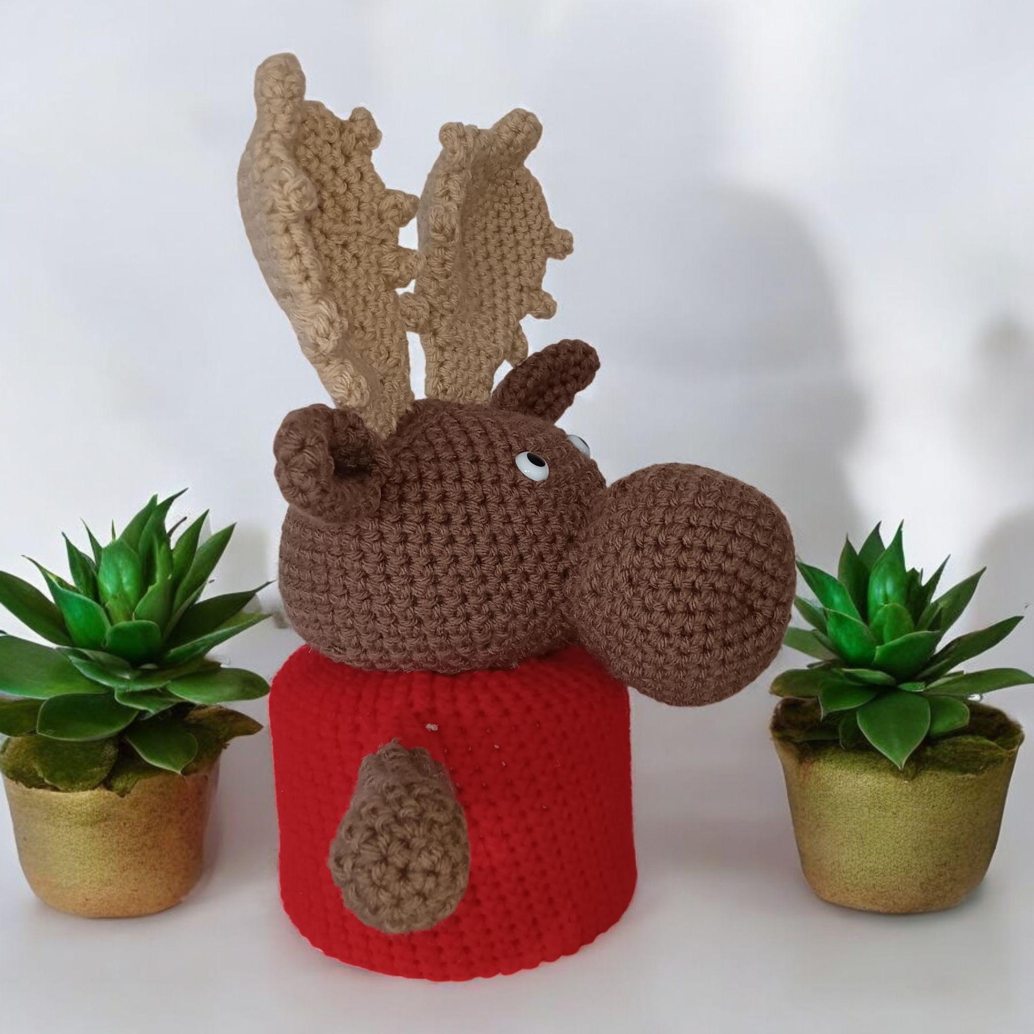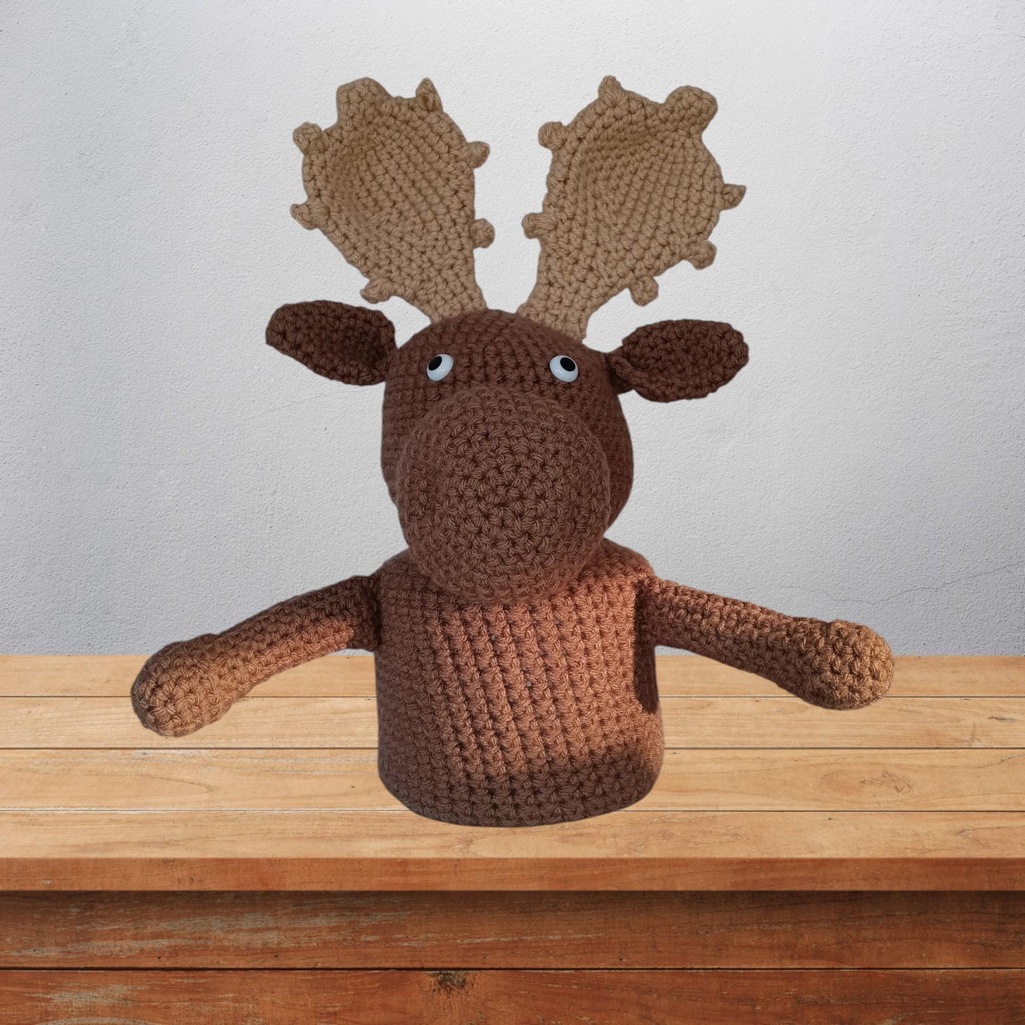 Hide that precious spare roll of toilet paper in this hand crocheted moose bathroom accessory. Toilet paper cover is modeled on mega size roll.