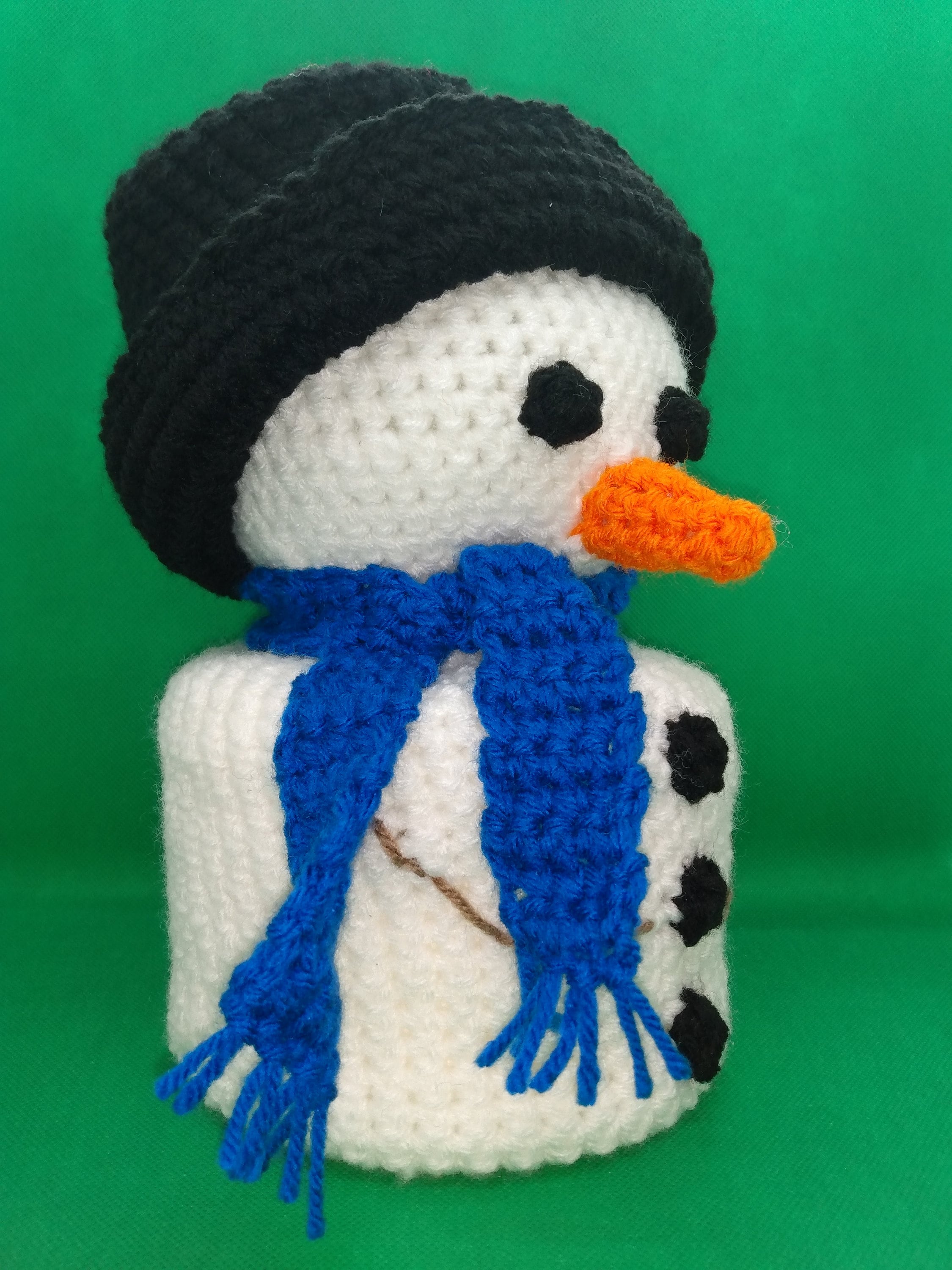 This hand crocheted Snowman Toilet Paper Cover will keep that precious extra roll hidden but handy with this cute seasonal bathroom accessory. This cute bathroom accessory matches any bathroom décor. This toilet tissue holder makes a great handmade gift for nearly anyone! Please select your preferred scarf color when ordering. Modeled on mega size roll of toilet paper.