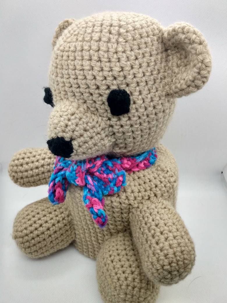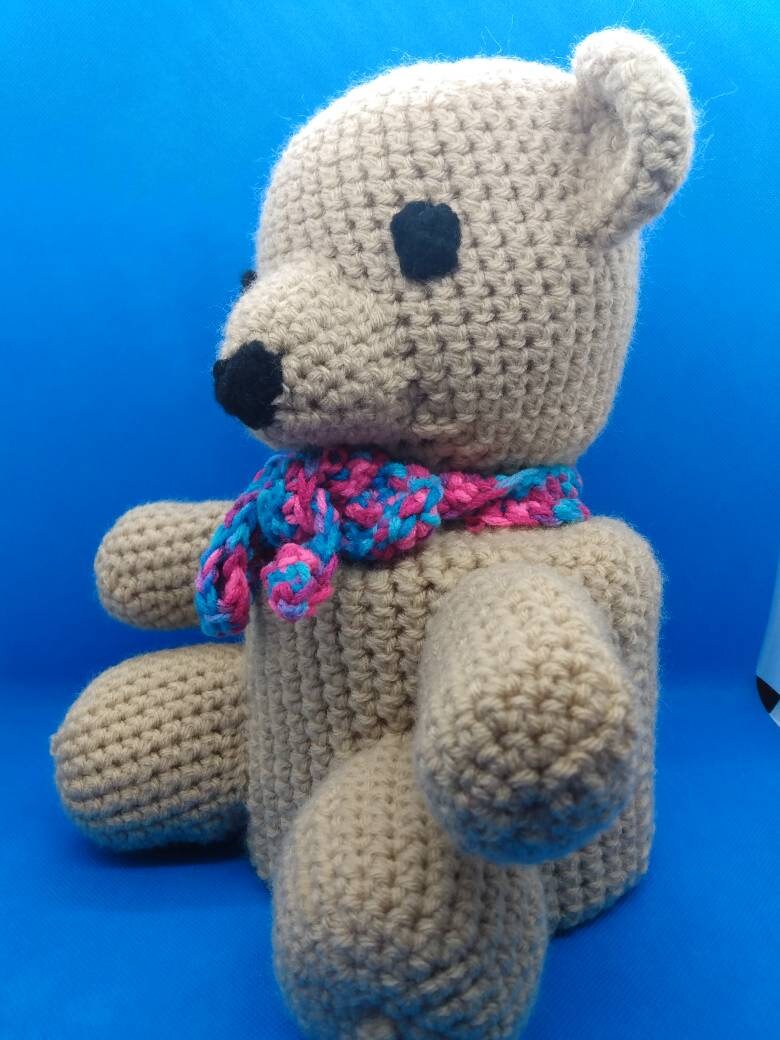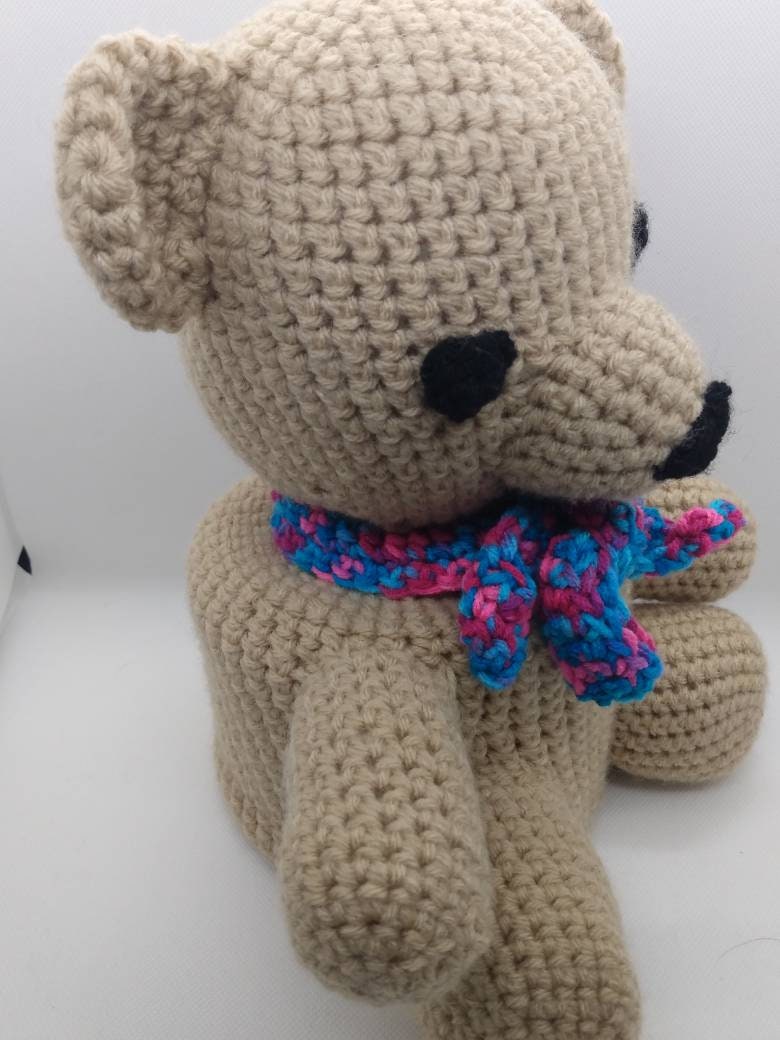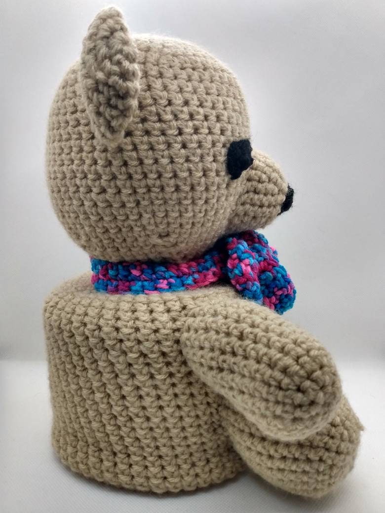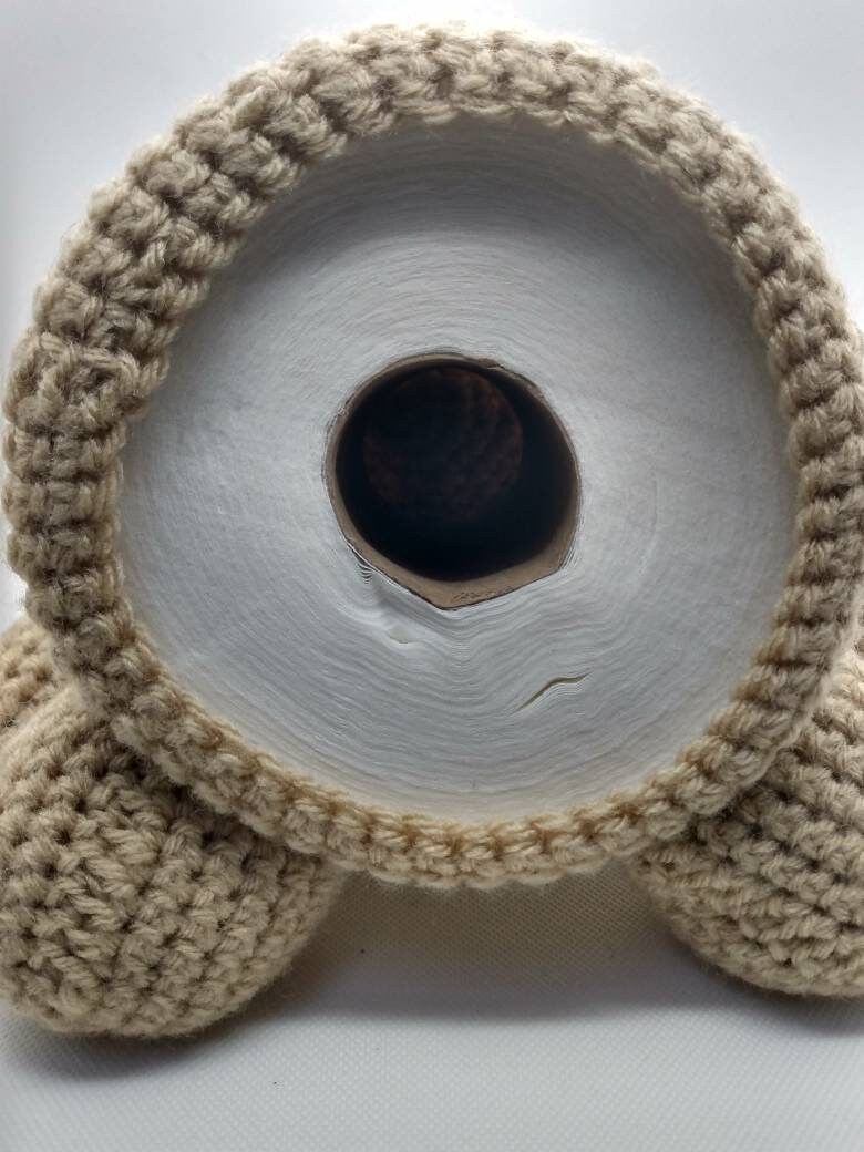 Hide that precious spare roll of toilet paper in this hand crocheted teddy bear bathroom accessory. Toilet paper cover is modeled on mega size roll.